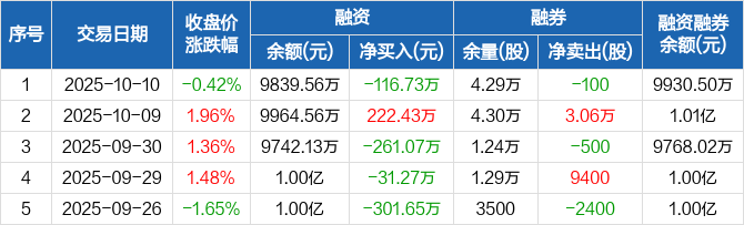海天精工:融资净偿还116.73万元,融资余额9839.56万元(10-10)