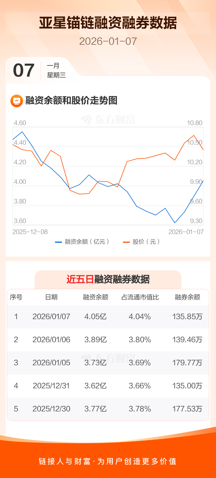 交易所最新数据显示,亚星锚链于2026年1月7日获融资买入5218.77万元,融资偿还3630.53万元,当日融资净买入1588.24万元。目前,该股融资余额4.05亿,占流通市值比例为4.04%。
