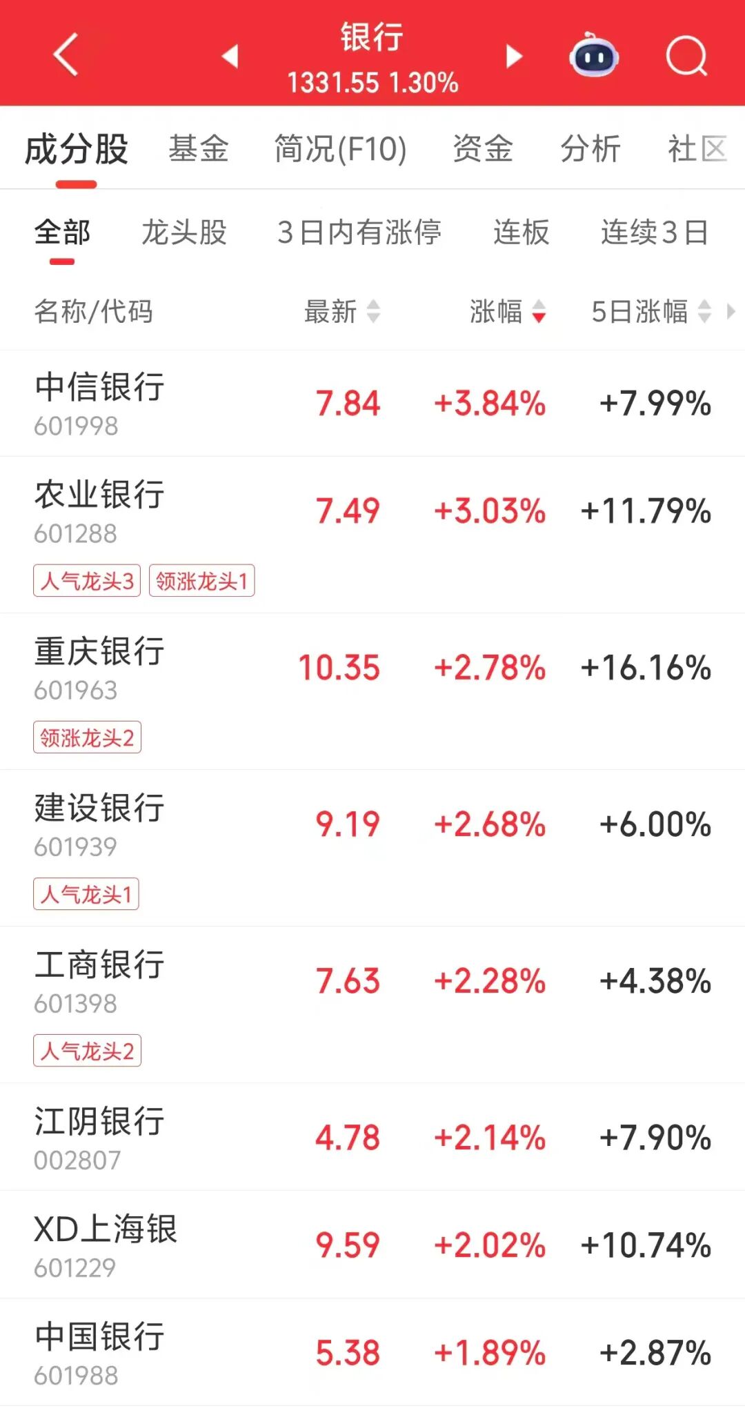 今日午后,煤炭股持续走强,安泰集团等个股涨停,千亿龙头中煤能源A、H股双双大涨;银行板块震荡拉升,农业银行逼近历史高点;尾盘鸿蒙概念异动拉升,常山北明直线涨停,位于同花顺热榜第一名。小金属、钢铁、贵金属板块回调明显。