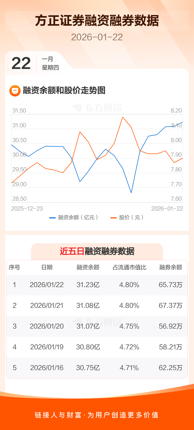 交易所最新数据显示,方正证券于2026年1月22日获融资买入9968.42万元,融资偿还8702.72万元,当日融资净买入1265.7万元。目前,该股融资余额31.23亿,占流通市值比例为4.80%。