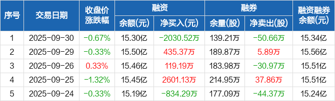 浙商银行:融资净偿还2030.52万元,融资余额15.3亿元(09-30)