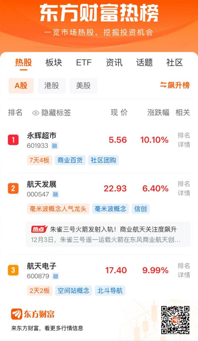12月16日,两市延续调整,创业板指领跌。东方财富热榜前三的股票中,永辉超市位列第1,航天发展位列第2,航天电子位列第3。