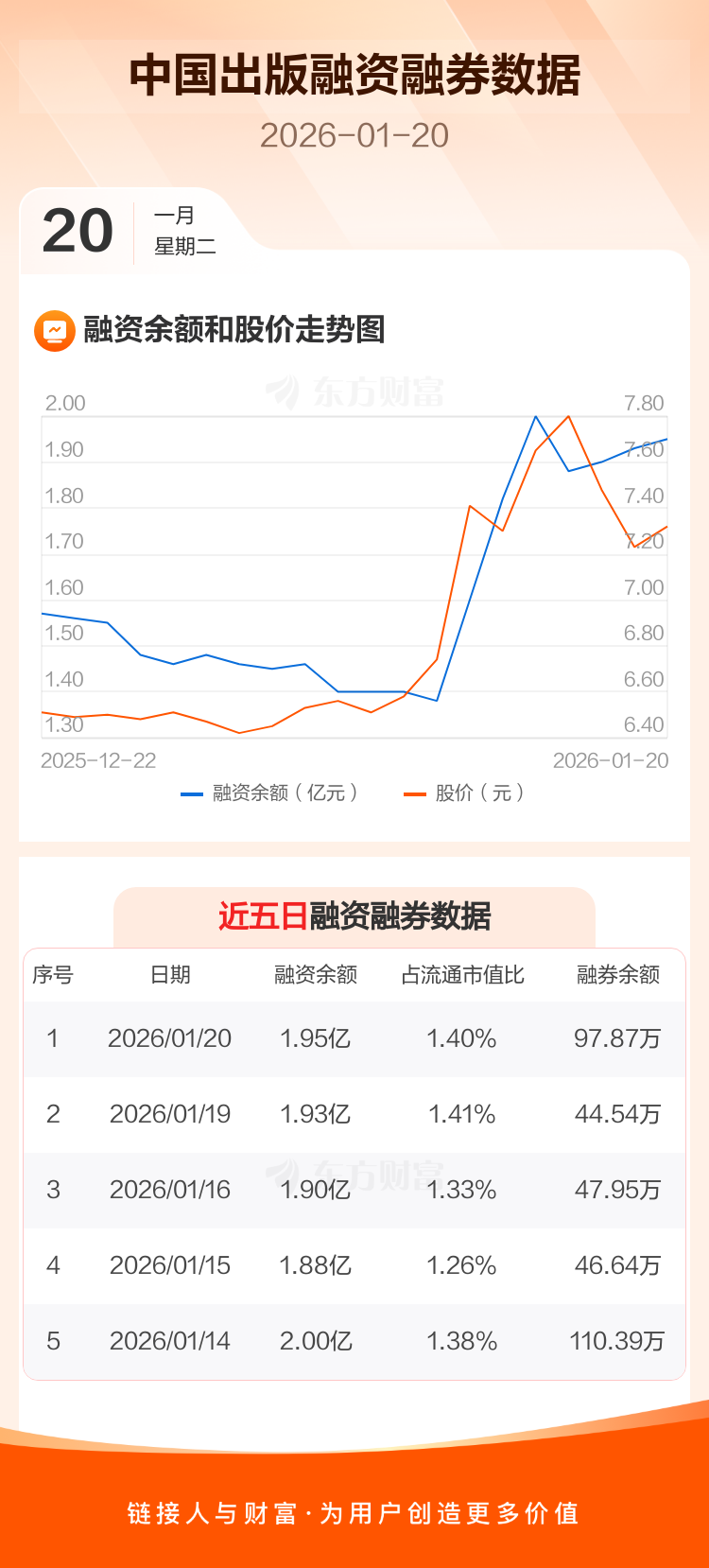 交易所最新数据显示,中国出版于2026年1月20日获融资买入3073.82万元,融资偿还2904.79万元,当日融资净买入169.02万元。目前,该股融资余额1.95亿,占流通市值比例为1.40%。