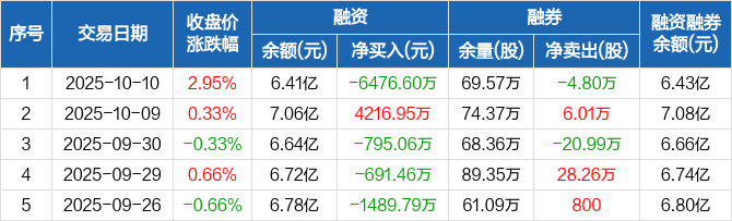 融资方面,当日融资买入7486.09万元,融资偿还1.4亿元,融资净偿还6476.6万元。融券方面,融券卖出2700股,融券偿还5.07万股,融券余量69.57万股,融券余额218.45万元。融资融券余额合计6.43亿元。