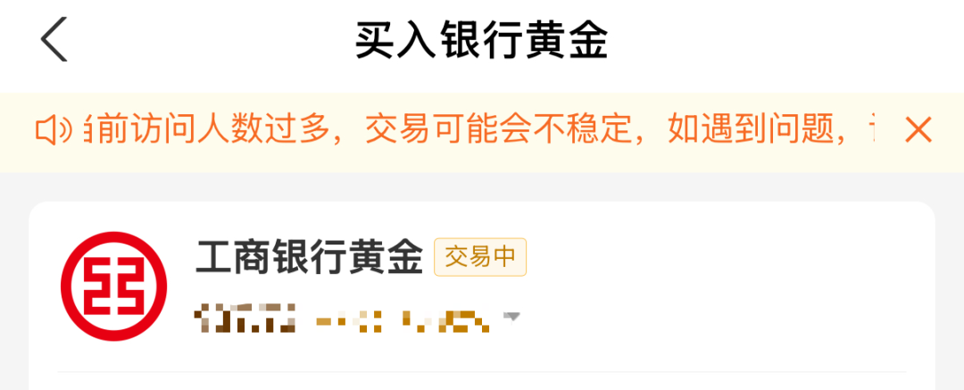 据多家媒体报道,今日(10月14日)盘中,在蚂蚁财富平台上销售的工商银行积存金一度出现“不可开户”情况。截至发稿,开户已恢复正常。不过,记者注意到,在支付宝APP“买入银行黄金”的页面上,已有滚动提示:“当前访问人数过多,交易可能会不稳定,如遇到问题,请尝试重试操作。”