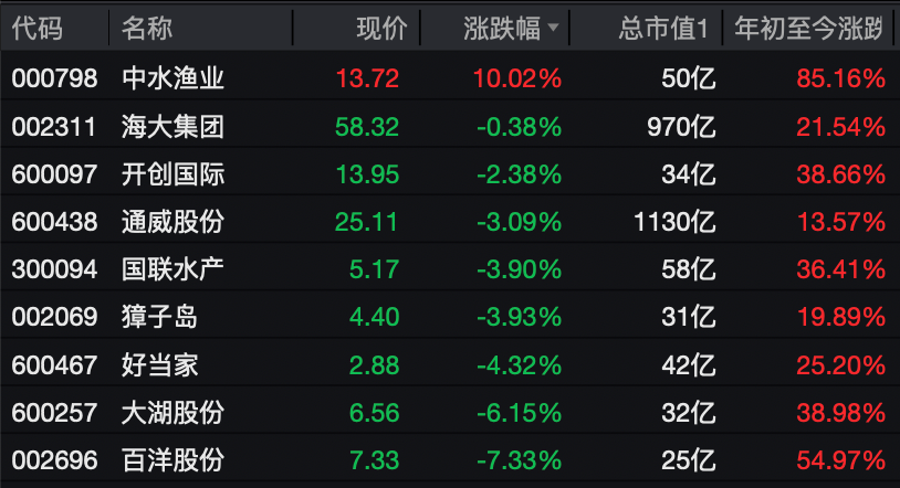 截至午盘,中水渔业报13.72元/股,最新市值为50亿元。