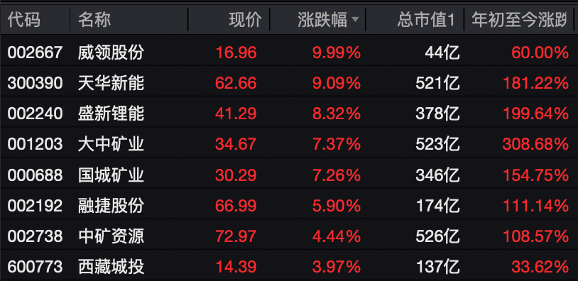 热门股方面,威领股份、大为股份录得10cm涨停,大中矿业一度涨停,天华新能涨超9%,盛新锂能涨近8%,盐湖股份、藏格矿业、融捷股份跟涨。