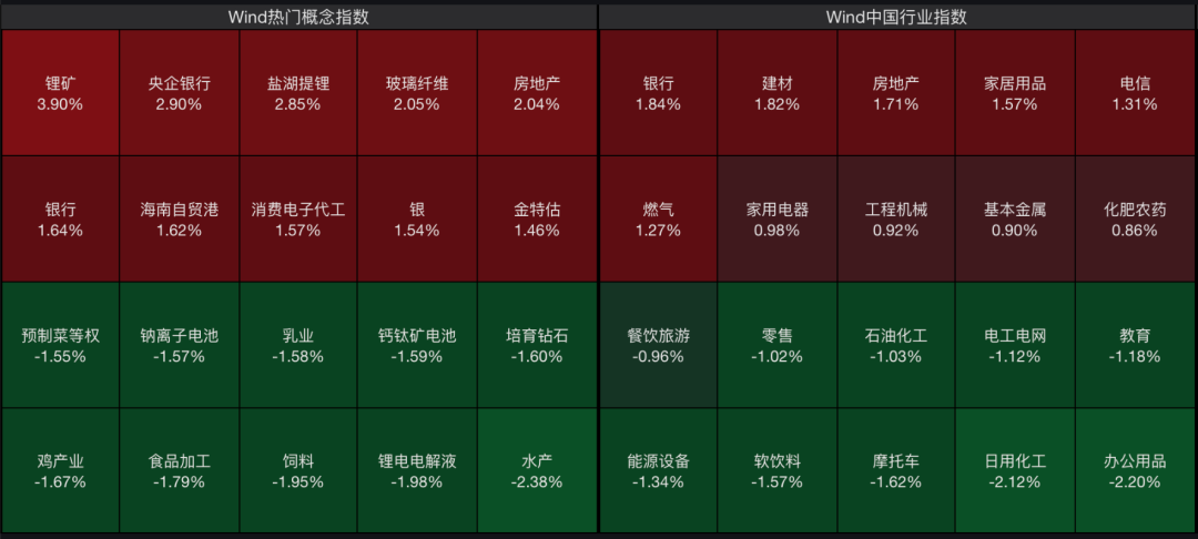 从板块看,银行股全线飘红,锂矿板块再度爆发,摩尔线程、海南自贸港、稀有金属、房地产等概念板块走强;零售、软饮料、餐饮旅游等消费板块明显回调,水产、锂电电解液概念板块走弱。