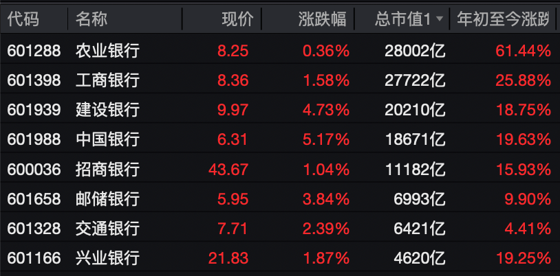 建设银行涨4.73%,邮储银行、民生银行涨超3%,光大银行、中信银行、华夏银行等跟涨。