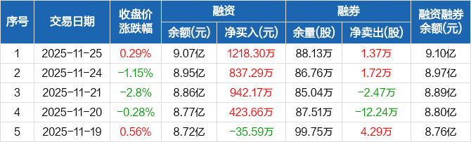 融资方面,当日融资买入2816.83万元,融资偿还1598.52万元,融资净买入1218.3万元,连续4日净买入累计3421.42万元。融券方面,融券卖出3.11万股,融券偿还1.74万股,融券余量88.13万股,融券余额303.17万元。融资融券余额合计9.1亿元。