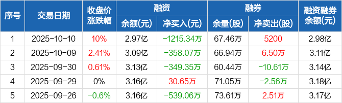 融资方面,当日融资买入3577.88万元,融资偿还4793.22万元,融资净偿还1215.34万元,连续3日净偿还累计1922.75万元。融券方面,融券卖出4.71万股,融券偿还4.19万股,融券余量67.46万股,融券余额126.15万元。融资融券余额合计2.98亿元。