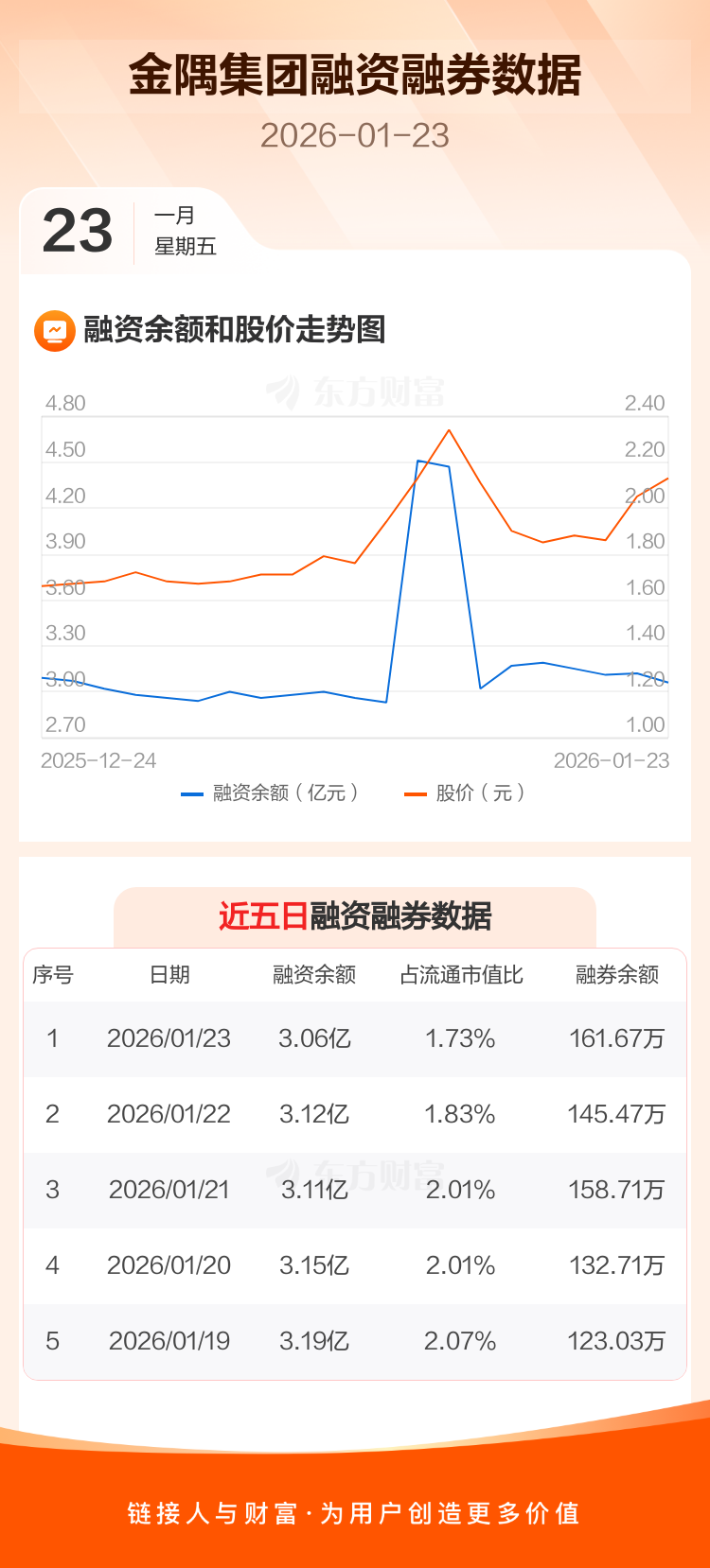 交易所最新数据显示,金隅集团于2026年1月23日获融资买入6587.87万元,融资偿还7158.34万元,当日融资净偿还570.47万元。目前,该股融资余额3.06亿,占流通市值比例为1.73%。