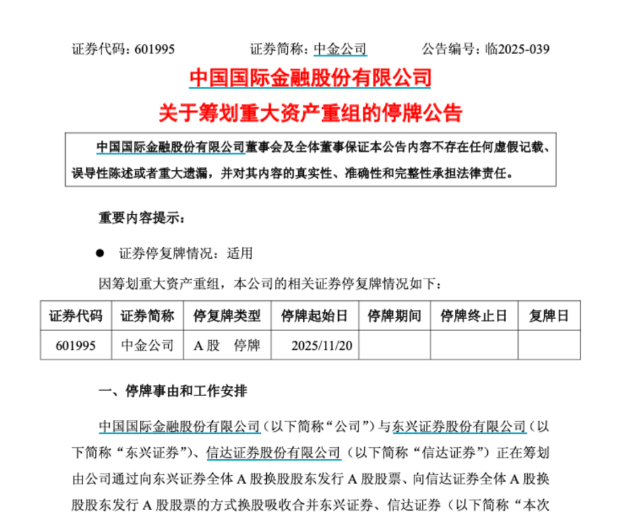 11月19日晚,三家券商同步发布《关于筹划重大资产重组的停牌公告》,揭晓了这宗由中金公司通过换股方式吸收合并后两者的重磅方案,自11月20日起,三家券商将正式停牌,预计停牌时间不超过25个交易日。
