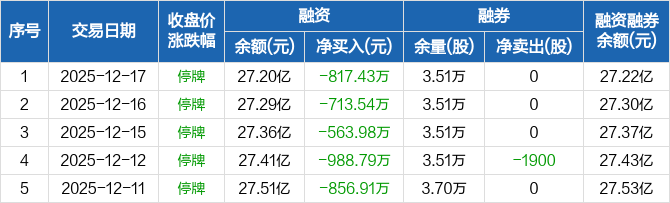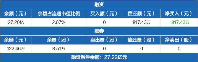 融资方面,当日融资买入0元,融资偿还817.43万元,融资净偿还817.43万元,连续20日净偿还累计2.21亿元。融券方面,融券卖出0股,融券偿还0股,融券余量3.51万股,融券余额122.46万元。融资融券余额合计27.22亿元。