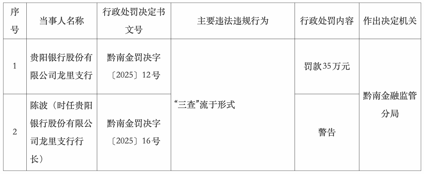 因“三查”流于形式,贵阳银行股份有限公司龙里支行被罚款35万元,陈波(时任贵阳银行股份有限公司龙里支行行长)被警告。