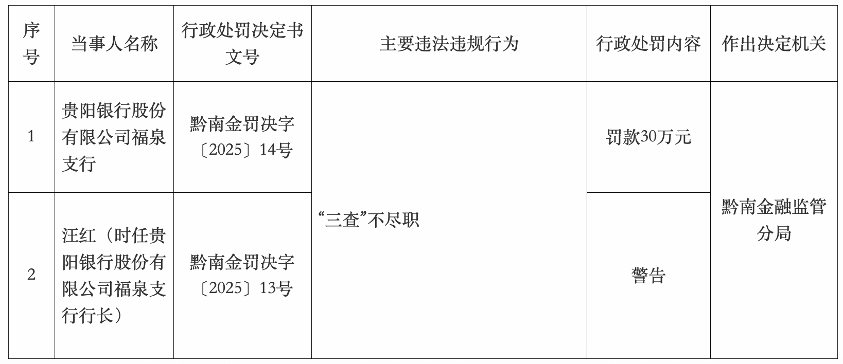 具体来看,因“三查”不尽职,贵阳银行股份有限公司福泉支行被罚款30万元,汪红(时任贵阳银行股份有限公司福泉支行行长)被警告。