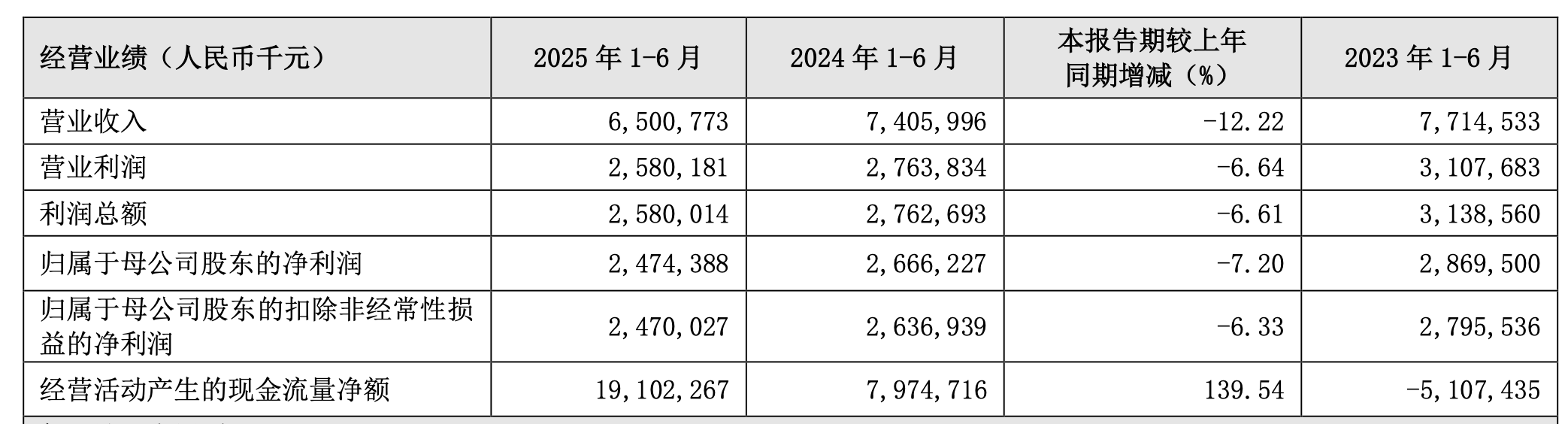 今年上半年,贵阳银行实现营收65.01亿元,同比下降12.22%;归母净利润24.74亿元,同比下降7.2%。