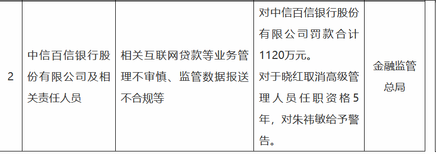 中信百信银行收千万元罚单!互联网贷款业务管理不审慎、监管数据报送不合规