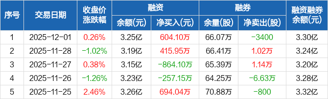 中信银行:融资净买入604.1万元,融资余额3.25亿元(12-01)