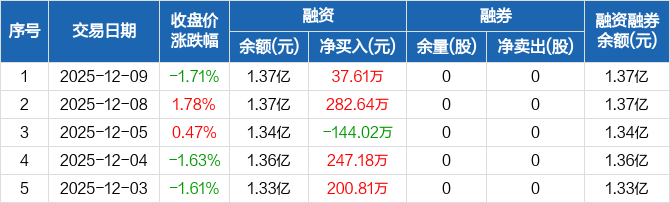鼎龙科技融资融券信息显示,2025年12月9日融资净买入37.61万元;融资余额1.37亿元,较前一日增加0.27%。