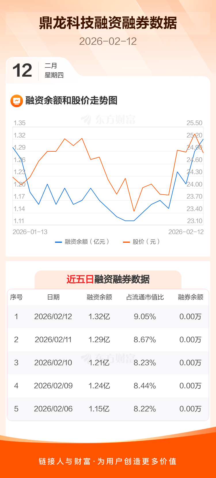 交易所最新数据显示,鼎龙科技于2026年2月12日获融资买入1054.98万元,融资偿还749.65万元,当日融资净买入305.32万元。目前,该股融资余额1.32亿,占流通市值比例为9.05%。