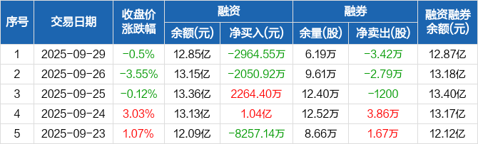 晶方科技:融资净偿还2964.55万元,融资余额12.85亿元(09-29)