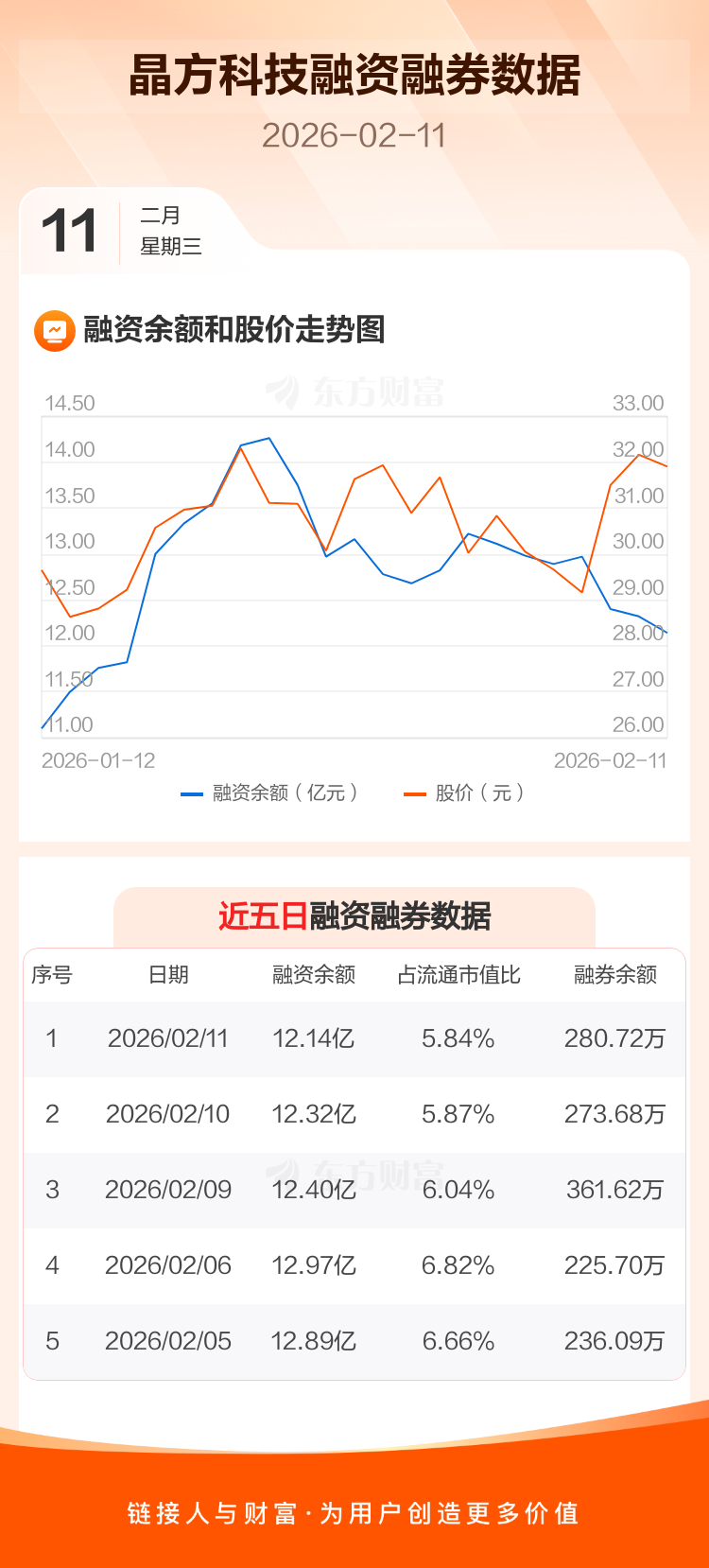 交易所最新数据显示,晶方科技于2026年2月11日获融资买入1.58亿元,融资偿还1.76亿元,当日融资净偿还1772.82万元。目前,该股融资余额12.14亿,占流通市值比例为5.84%。
