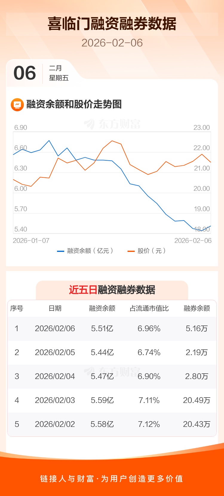 交易所最新数据显示,喜临门于2026年2月6日获融资买入2178.73万元,融资偿还1429.06万元,当日融资净买入749.66万元。目前,该股融资余额5.51亿,占流通市值比例为6.96%。