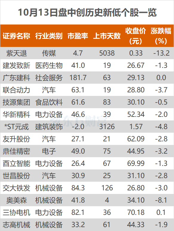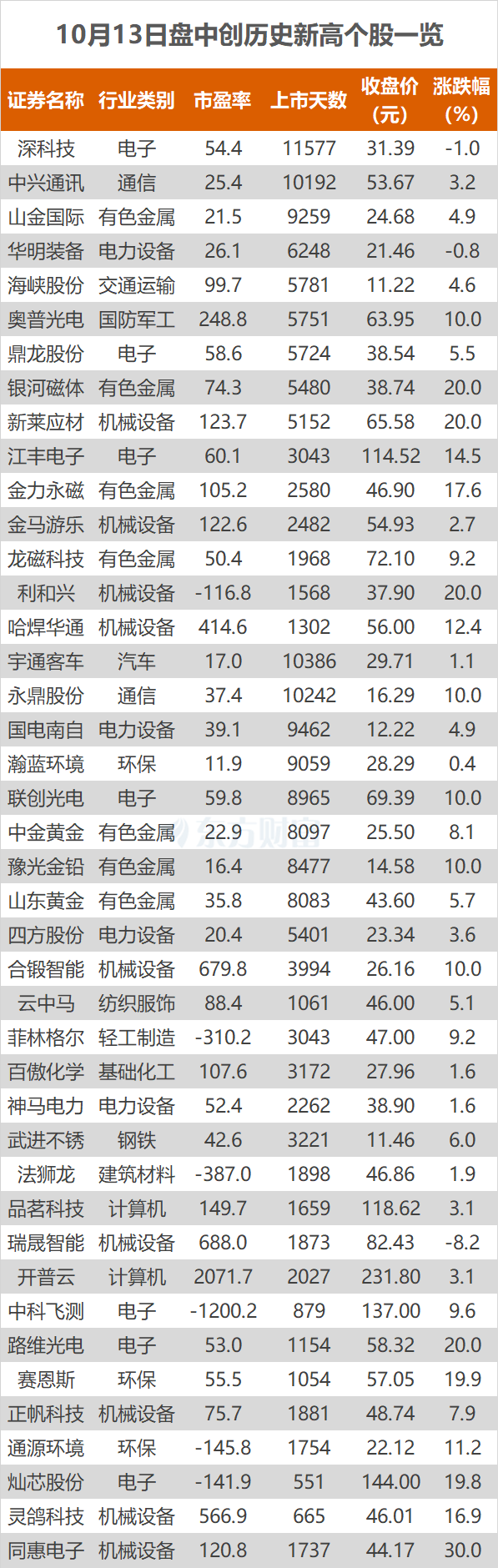 10月13日,A股三大指数今日集体回调,市场全天震荡回升,截止收盘,沪指跌0.19%,收报3889.50点;深证成指跌0.93%,收报13231.47点;创业板指跌1.11%,收报3078.76点。东方财富Choice数据显示,今日有42只个股盘中股价创历史新高,分别为合锻智能、新莱应材等。