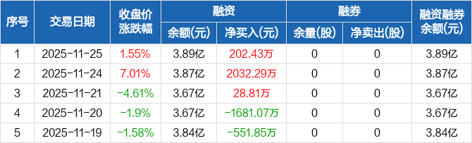 合锻智能融资融券信息显示,2025年11月25日融资净买入202.43万元;融资余额3.89亿元,较前一日增加0.52%。