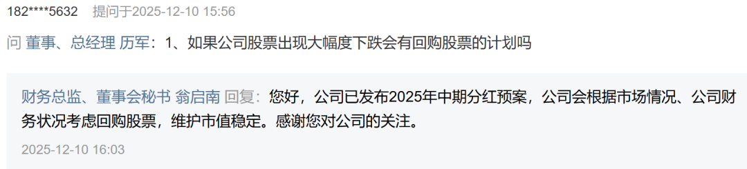 在回应“如果公司股票出现大幅下跌是否会有回购股票的计划”时,翁启南表示,“公司已发布2025年中期分红预案,会根据市场情况、公司财务状况考虑回购股票,维护市值稳定”。