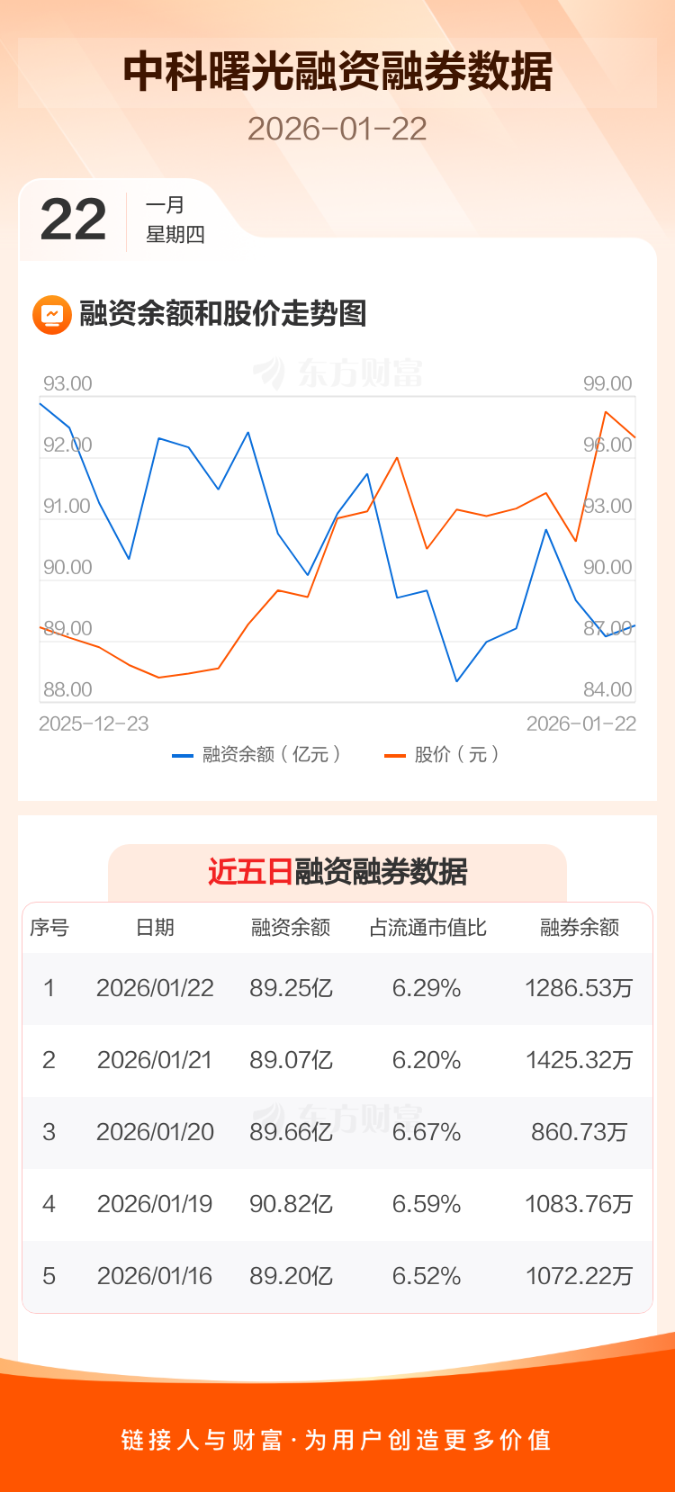 交易所最新数据显示,中科曙光于2026年1月22日获融资买入10.89亿元,融资偿还11.11亿元,当日融资净偿还2222.19万元。目前,该股融资余额89.25亿,占流通市值比例为6.29%。