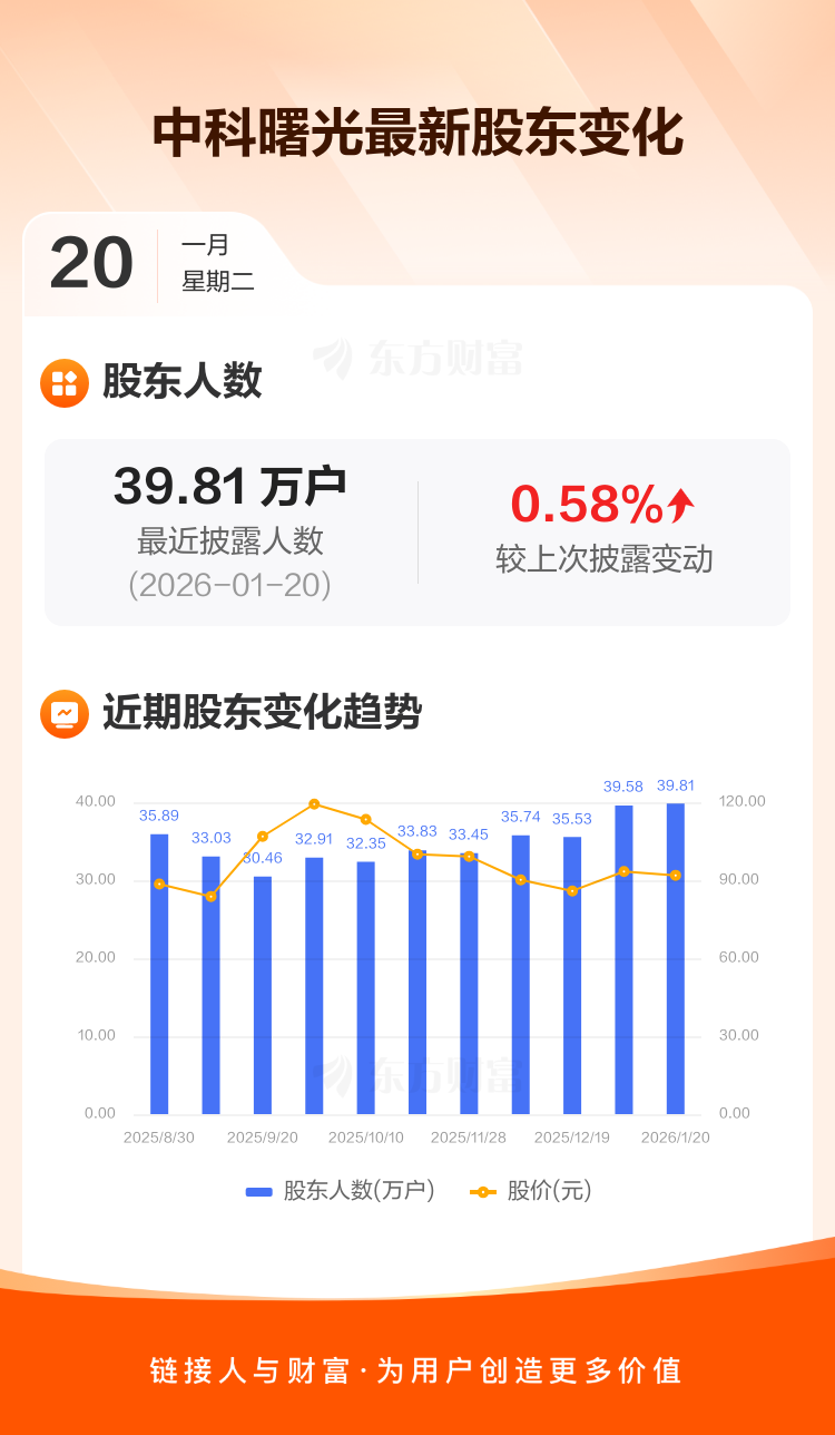 中科曙光最新披露数据显示,截至1月20日公司股东户数为39.81万户,较上期(2026年1月9日)增加2302户,增幅为0.58%。户均持有流通股数量由上期的3695股下降至3674股,户均持股金额由上期的34.49万元减少至33.75万元。