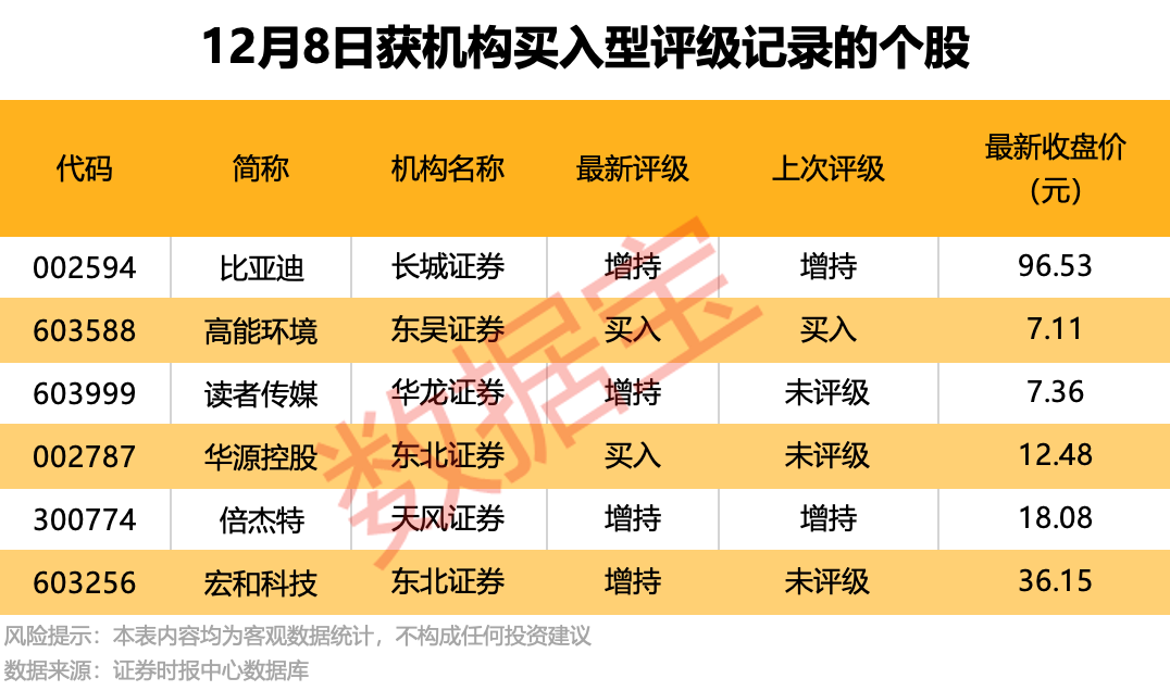 据数据宝统计,今日机构研报共发布6条买入型评级记录,共涉及6股,包括比亚迪、高能环境、读者传媒等。