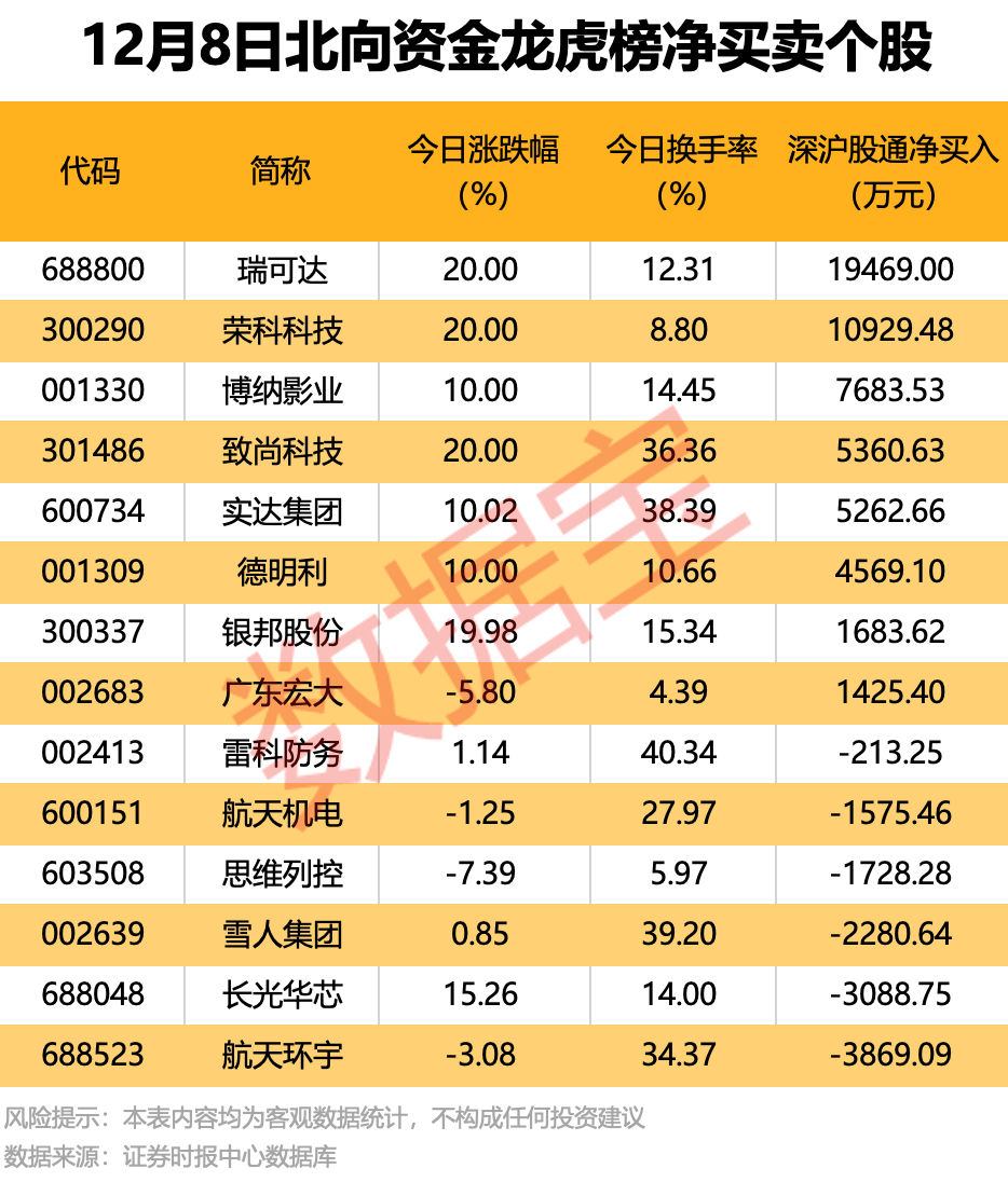 今日龙虎榜现身个股中,8股获北向资金净买入。净买入居首的是瑞可达,金额为1.95亿元。荣科科技、博纳影业、致尚科技等随后,净买入金额均超5000万元。
