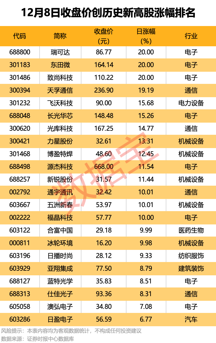 收盘价创历史新高股中,今日股价平均上涨7.42%,涨停的有瑞可达、东田微、致尚科技等,涨幅居前的有天孚通信、飞沃科技、长光华芯等。