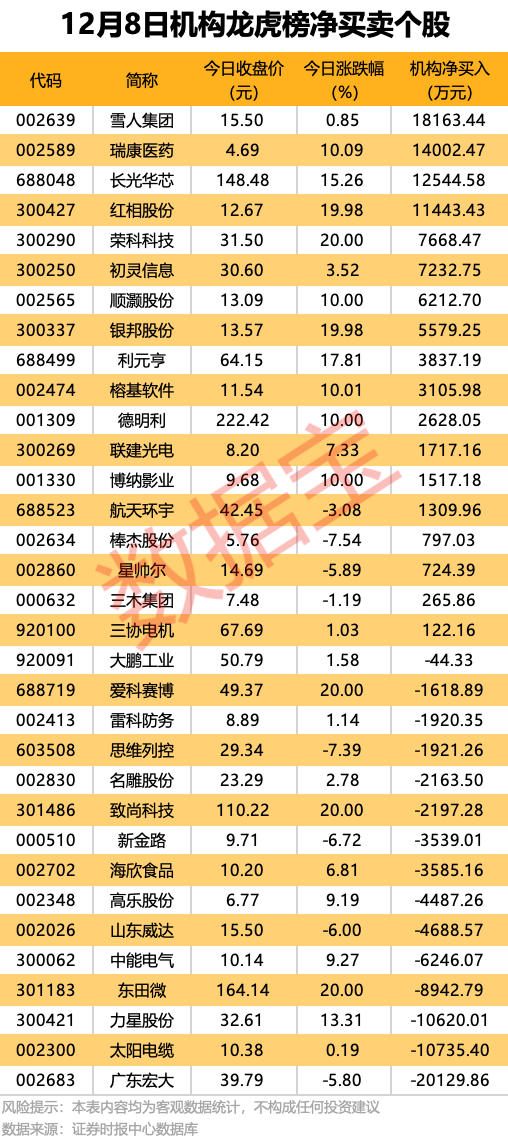 今日龙虎榜中,净买入个股有18只,净卖出的个股为15只。14股净买入金额均超千万元,雪人集团获机构净买入1.82亿元,居首;其次是瑞康医药,机构净买入金额为1.4亿元。