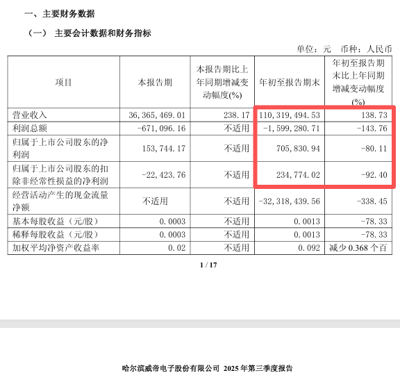 2025年前三季度,威帝股份的营业收入为1.10亿元,同比增长138.73%;归母净利润为70.58万元,同比下降80.11%;扣非后净利润为23.48万元,同比下降92.40%。