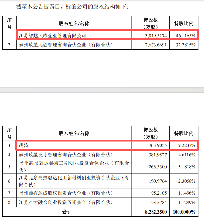 公告显示,玖星精密的股东除了智越天成,还包括泰州玖星元创管理咨询合伙企业(有限合伙)、胡涛、泰州玖星英才管理咨询合伙企业(有限合伙)等,其中胡涛的直接持股比例为9.2233%。