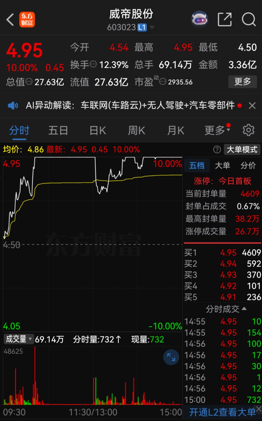 截至12月8日收盘,威帝股份报4.95元/股,涨幅达10%,总市值为27.63亿元。