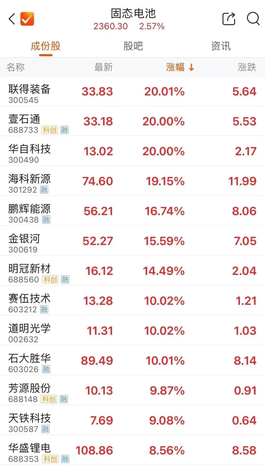 11月27日午后,固态电池板块持续拉升,华自科技、石大胜华(603026)封上涨停,截至发稿,海科新源涨超19%,华盛锂电、天铁科技等跟涨。