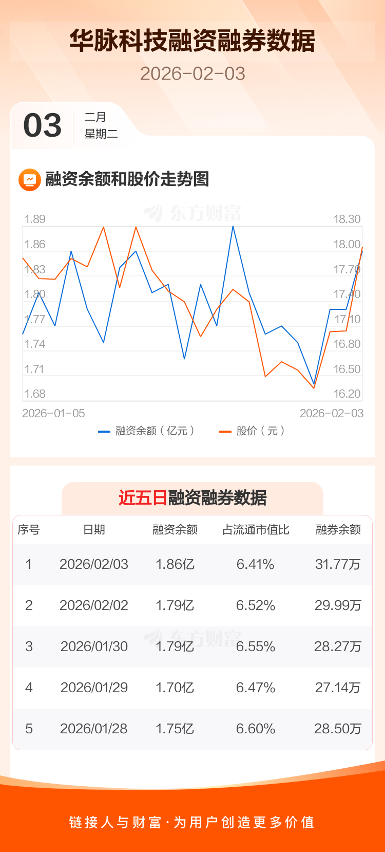 交易所最新数据显示,华脉科技于2026年2月3日获融资买入5062.90万元,融资偿还4346.37万元,当日融资净买入716.53万元。目前,该股融资余额1.86亿,占流通市值比例为6.41%。