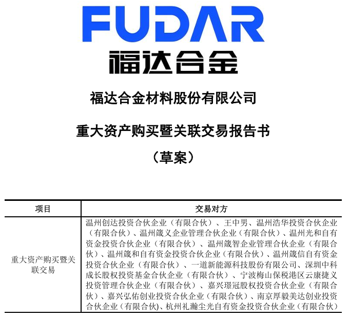 今年9月26日晚间,福达合金公告,公司拟以支付现金方式购买温州创达投资合伙企业(有限合伙)、王中男等15名交易对手方持有的浙江光达电子科技有限公司(以下简称“光达电子”)52.61%股权,交易金额为3.52亿元。