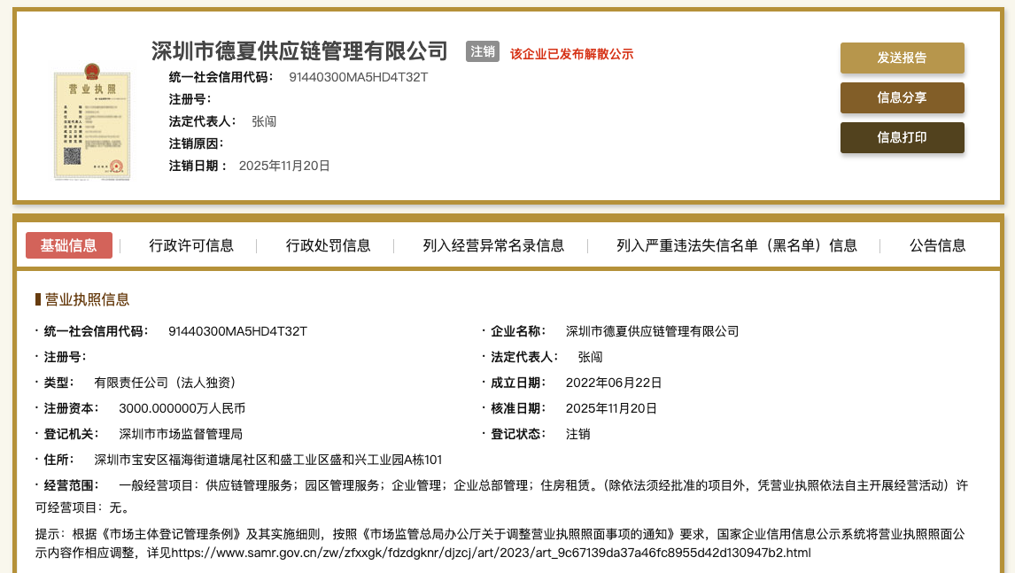 国家企业信用信息公示系统网站显示,11月20日,深圳市德夏供应链管理有限公司登记状态由存续变更为注销。