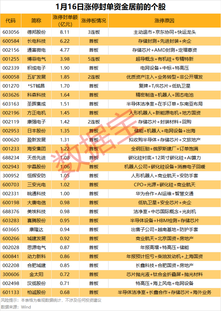 封死涨停的个股中,*ST阳光、*ST荣控等9股为ST股。以封单金额计算,德邦股份、长电科技、通富微电等涨停板封单资金居前,分别有8.11亿元、6.22亿元、4.77亿元。