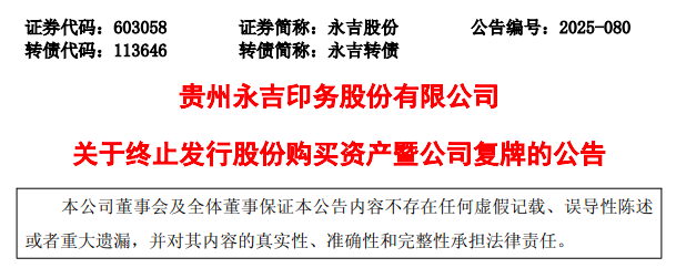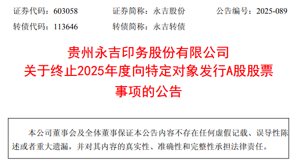 贵州烟标龙头永吉股份(603058)10月9日晚间公告,公司当日召开董事会和监事会会议,审议通过了相关议案,同意公司终止2025年度向特定对象发行A股股票事项。根据公司今年3月份披露的定增预案,本次定增募集资金总额约为4.9亿元。