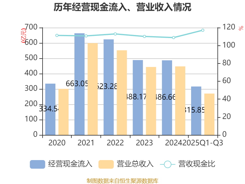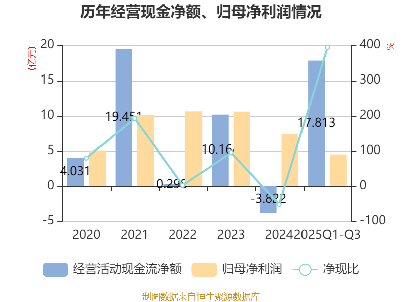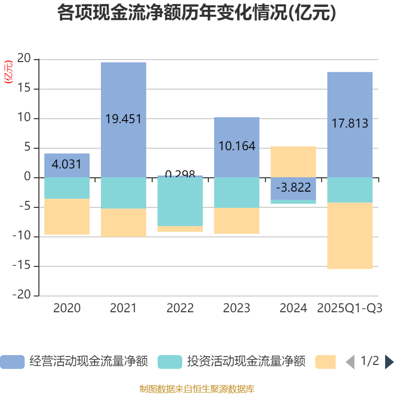 2025年前三季度,公司经营活动现金流净额为17.81亿元,同比增加21.34亿元;筹资活动现金流净额-11.22亿元,同比减少19.59亿元;投资活动现金流净额-4.3亿元,上年同期为-234.78万元。