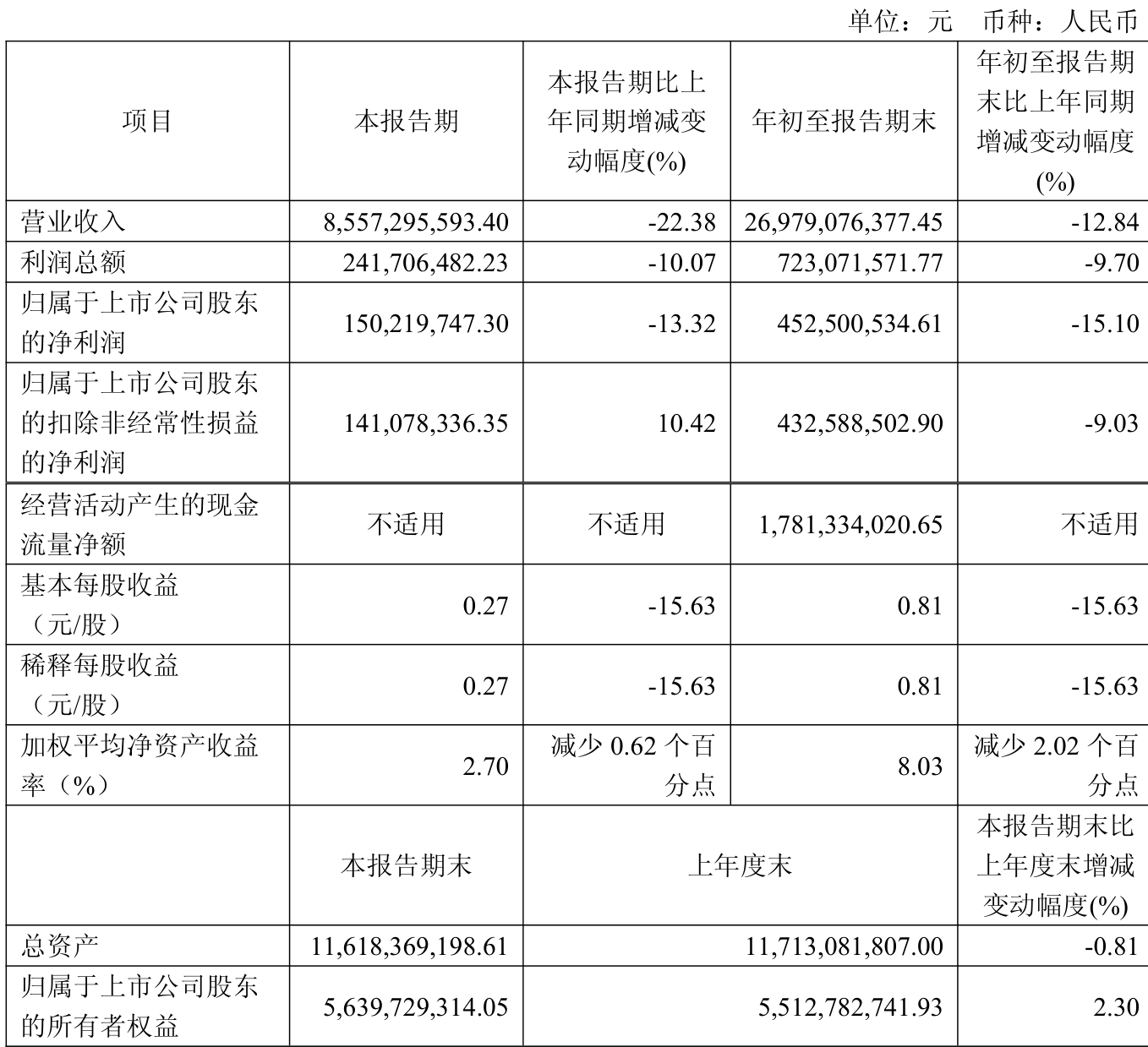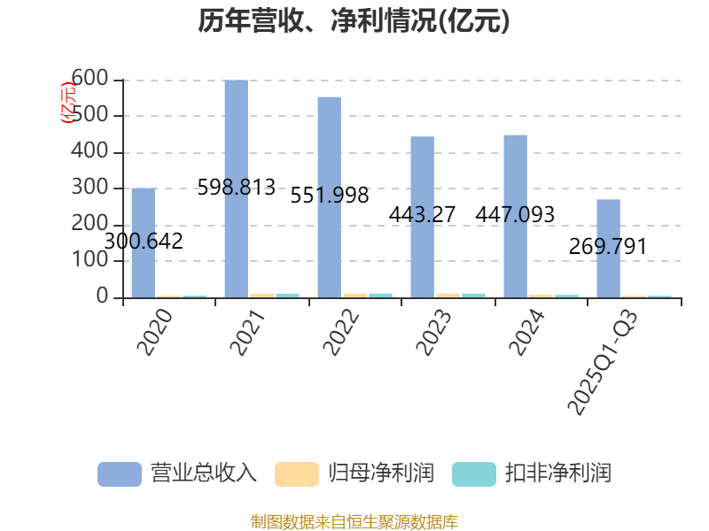 中证智能财讯物产环能(603071)10月21日披露2025年第三季度报告。前三季度公司实现营业总收入269.79亿元,同比下降12.84%;归母净利润4.53亿元,同比下降15.10%;扣非净利润4.33亿元,同比下降9.03%;经营活动产生的现金流量净额为17.81亿元,上年同期为-3.52亿元;报告期内,物产环能基本每股收益为0.81元,加权平均净资产收益率为8.03%。