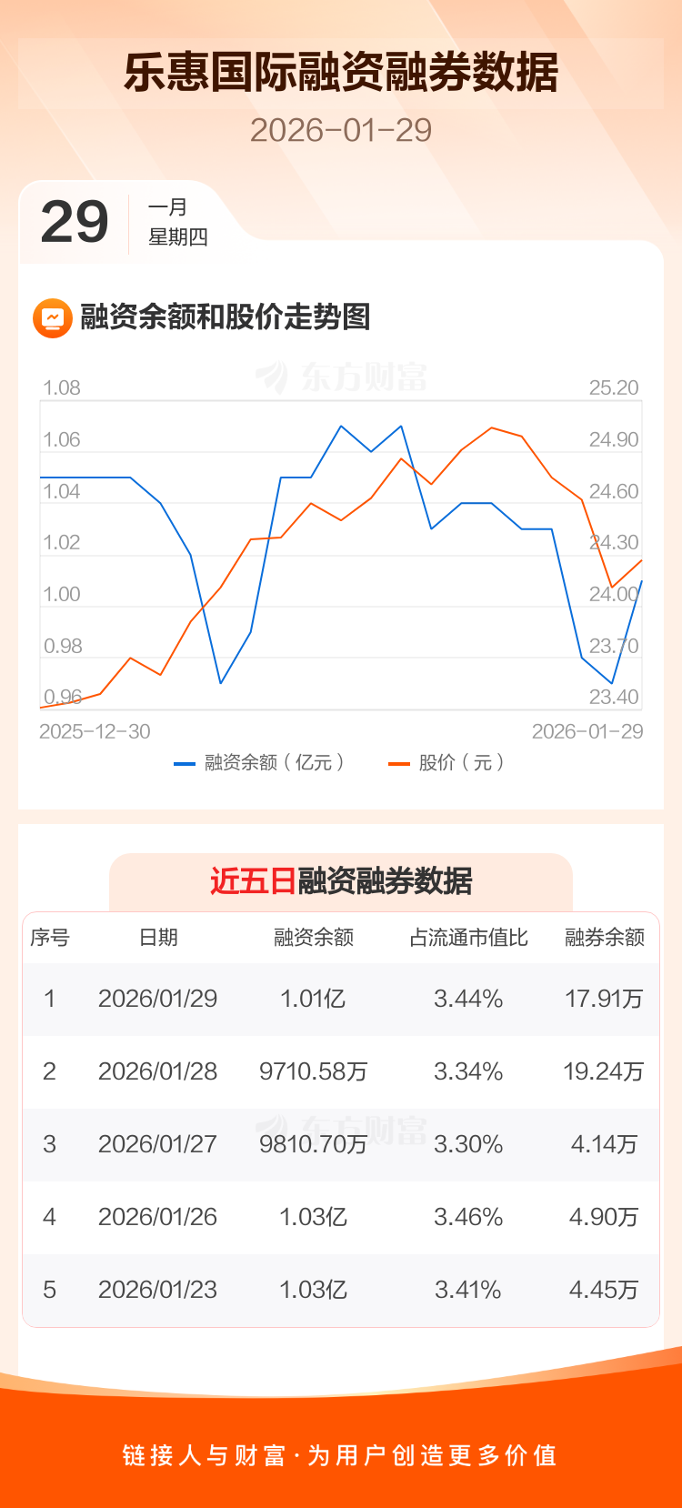 交易所最新数据显示,乐惠国际于2026年1月29日获融资买入709.14万元,融资偿还356.79万元,当日融资净买入352.36万元。目前,该股融资余额1.01亿,占流通市值比例为3.44%。