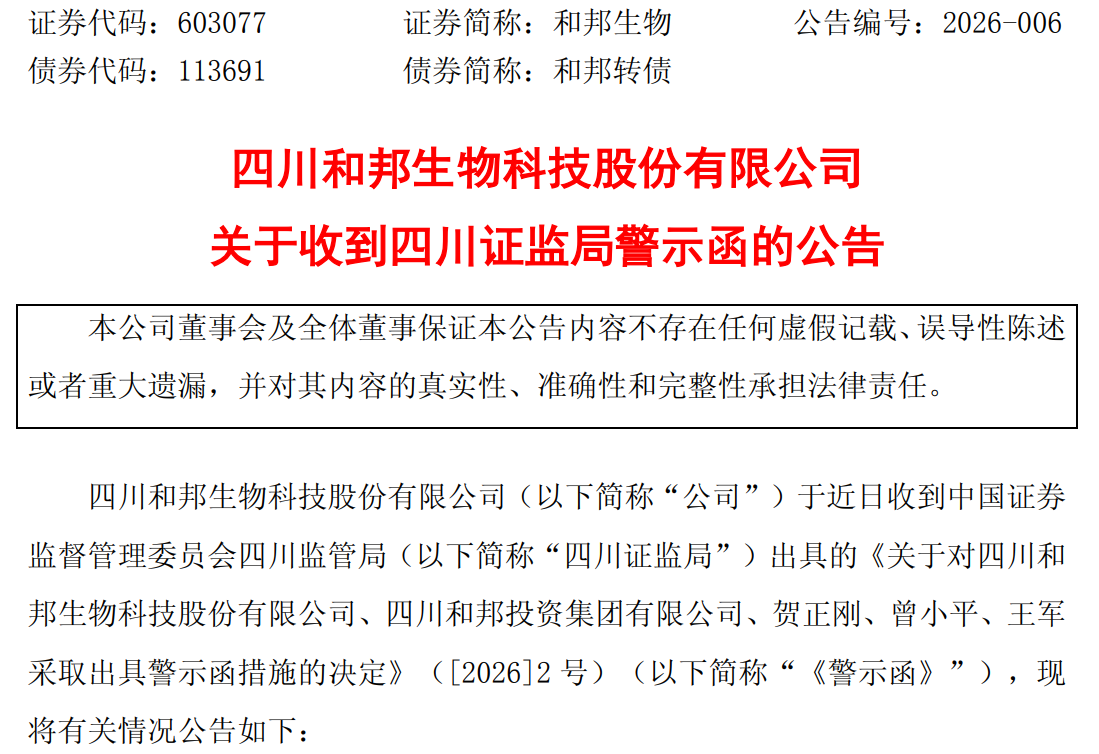 1月23日,上交所也发布《关于对四川和邦生物科技股份有限公司控股股东、实际控制人予以监管警示的决定》。